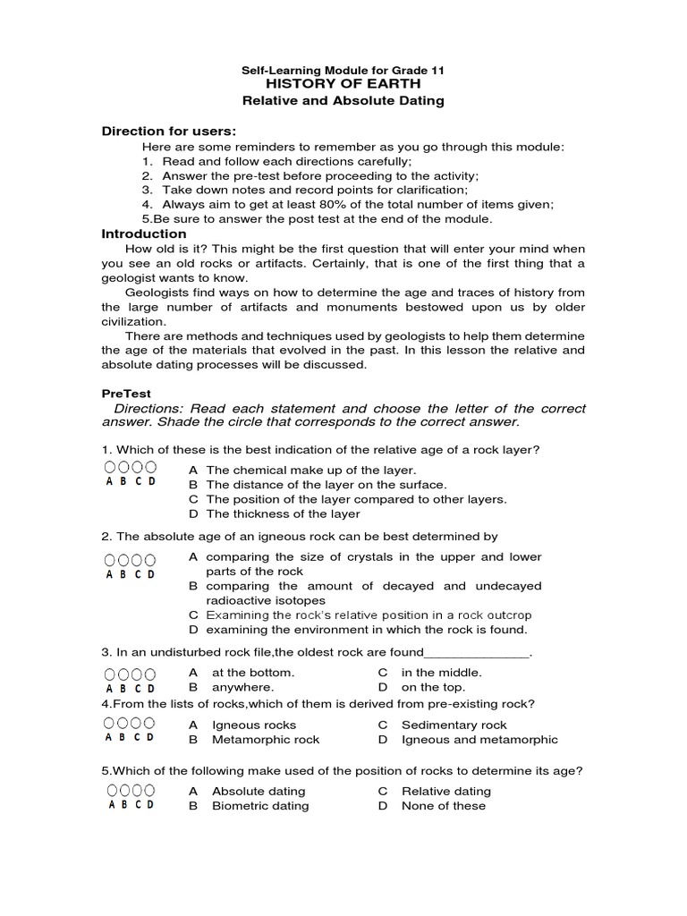 Some of the worksheets for this concept are absolute dating problems work, determining the age of rocks and fossils, part 1, relative dating work, exercise 2 relative and absolute dating of geologic events, key concept rocks provide a timeline for, please sign in or sign up to the, clues to earths past. Hutton also was the very first to understand the enormous amounts of time that would be required to make an unconformity, a location where sedimentary rocks. 622 relative dating the law of superposition in any undisturbed sequence of strata the oldest layer is at the bottom of the sequence and the youngest layer is at the top of the sequence. Before geologists can correlate the ages of rocks from different areas, they must first figure out the ages of rocks at a single location. This worksheet has 1 matching and 11 multiple choice questions.